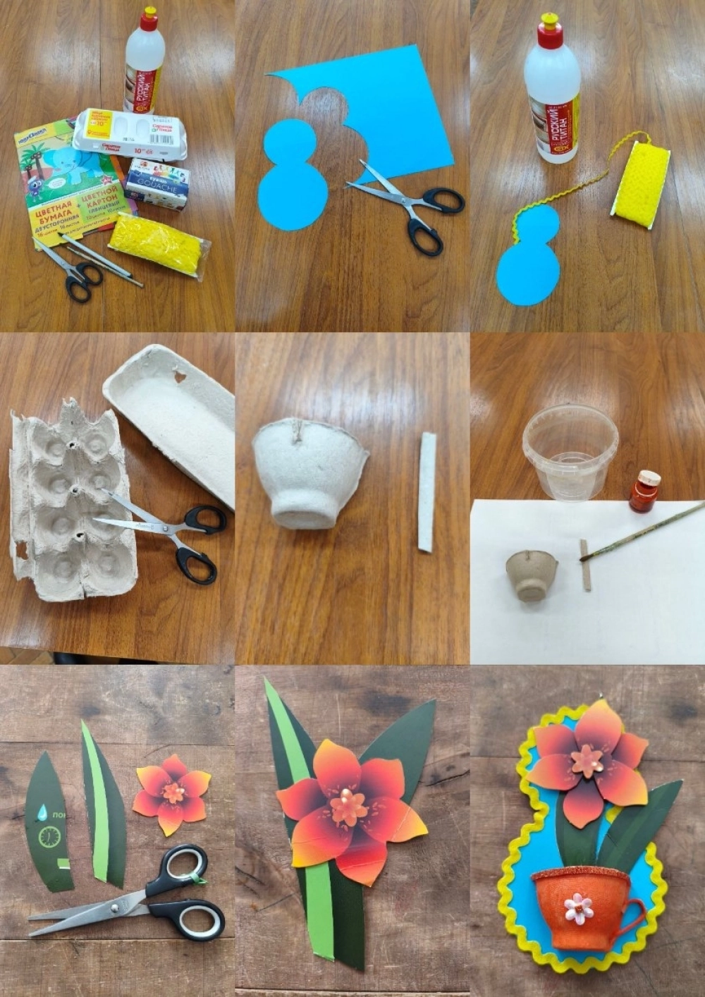 Шаг 3: Из упаковки для яиц следует вырезать формочку в виде чашки или горшка, как на фото ниже. Аналогичным образом изготавливается и ручка будущей посуды. Заготовку нужно раскрасить красками, после чего дать ей высохнуть. Затем следует приклеить ручку, тесьму или ленточку, размещая её по верхнему краю чашки, а также контрастный цветочек. Он располагается по центру.