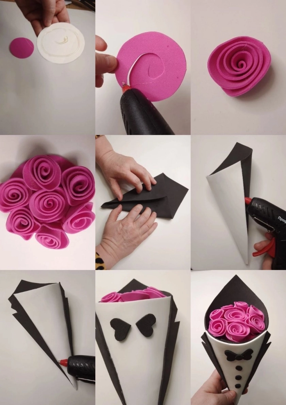 Шаг 3: Далее из чёрного фоамирана складывается конус, как на фото ниже. Такой же нужно сформировать и из белого (он будет меньшего размера). На второй конус следует приклеить чёрную бабочку и пуговицы. Затем при помощи клея-пистолета нужно соединить обе заготовки, образуя фрак и рубашку. Внутрь неё необходимо прикрепить картонку с розочками, формируя букет. После этого важно дать композиции хорошо подсохнуть.